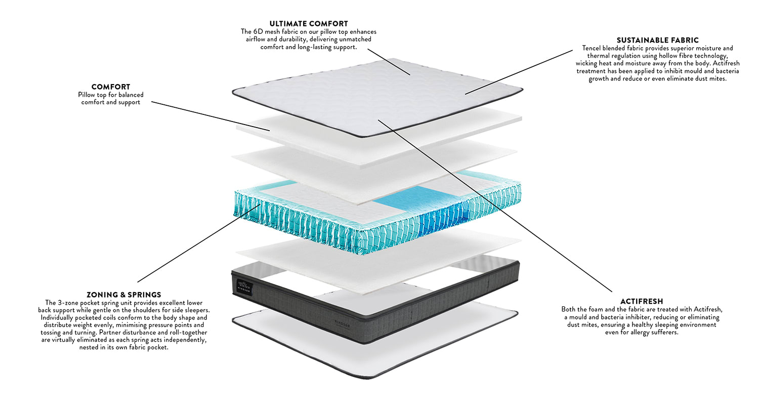 Great sleep, made simple. The Windsor mattress is the next evolution of our well-loved Silver range, bringing the same trusted comfort and quality with a fresh new look. Recommended by Choice Australia five times, Windsor delivers reliable support, breathable Tencel® fabric, and four comfort feels to suit every sleeper. No gimmicks. No inflated price tags. Just great sleep at a great price.